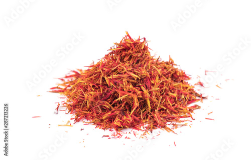 © nata777_7, Naklejka premium Dried saffron spice isolated on white background.