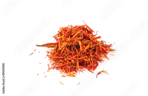 © nata777_7, Naklejka premium Dried saffron spice isolated on white background.