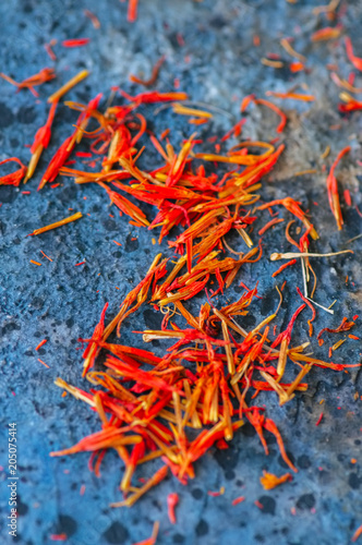© galiyahassan, Fototapeta premium Dried saffron spice on a blue stone background.