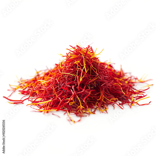 © Liudmila, Naklejka premium Dried saffron threads. Bunch of saffron stamens on white background. Spices. Saffron stigmas heap. High resolution photo