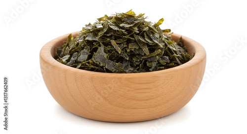© Mounir, Fototapeta premium Dried Seaweed Flakes in a Wooden Bowl on White Background – Healthy Asian Cuisine Ingredient