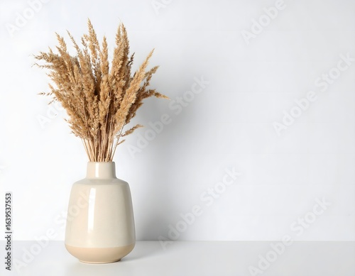 Naklejka premium Dried wheat stalks arranged in a beige ceramic vase, set against a clean...