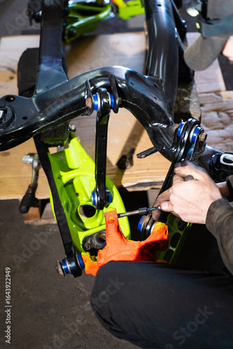 © Rabizo Anatolii, Obraz premium Drift suspension includes reinforced control arms and precision joints. Full Rear Suspension Assembly Process. Drift suspension includes reinforced control arms and precision joints.
