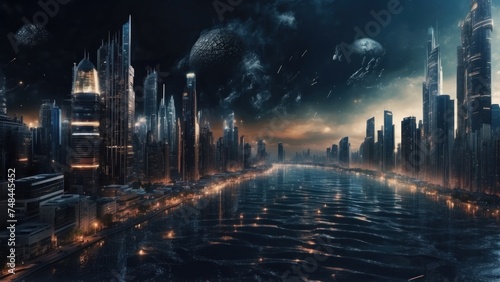 Fototapeta premium Drifting City in IT Technology Space Particles Background
