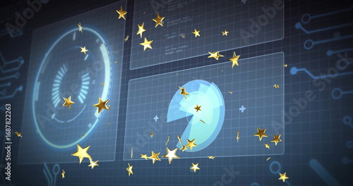 Fototapeta premium Drifting golden stars in virtual interface with gauge display pie-chart and circuit-grid motifs
