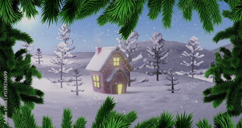 Naklejka premium Drifting snowflakes falling through forest clearing, with glowing cottage windows and fir branches