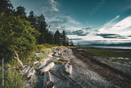 © Mathias, Fototapeta premium Driftwood i kłody na piaszczystej plaży na wyspie Vancouver z lasem i błękitnym niebem w backgorund.