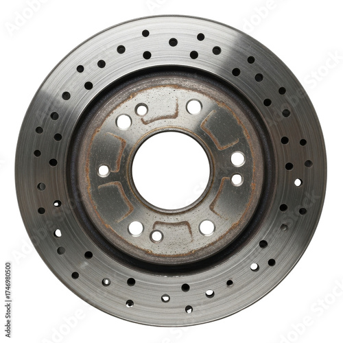 © Creative_Member, Obraz premium Drilled and perforated automotive brake rotor disk component for vehicle repair and engineering projects isolated PNG with Transparent Background