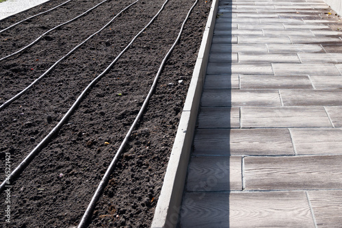 Fototapeta premium Drip irrigation system in planting bed. Empty bed with drip irrigation...