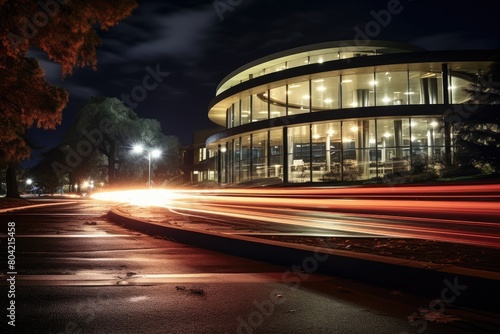 © OhmArt, Fototapeta premium Drive through a university campus at night.
