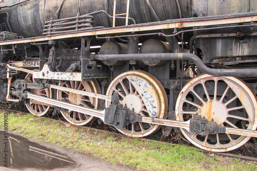 Naklejka premium Drive transmission mechanism in a historic and damaged steam locomotive standing on a sidetrack. Rail.