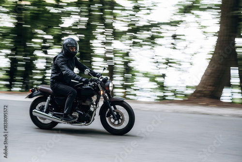 © standret, Fototapeta premium Driving fast. Man in leather clothes on motorcycle is on the road