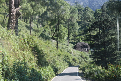 © Harshi & Kashi, Fototapeta premium Driving on a winding road through a green forest in the mountains during daylight hours