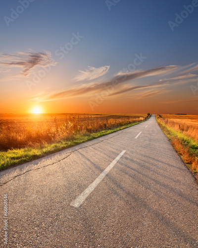 Naklejka premium Driving on an empty aspalt road at sunset