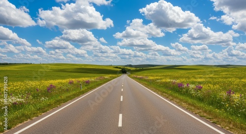 © CahyaSeptia, Fototapeta premium Driving Scenic Road Through Blooming Meadow Under Blue Sky with Clouds