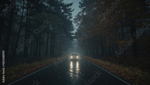 © Sai, Fototapeta premium Driving through a rainy forest road at dusk