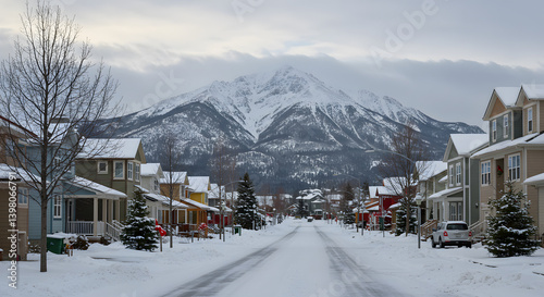© egavirgian art, Fototapeta premium Driving through snowy residential area with mountain backdrop