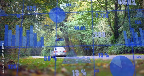 © vectorfusionart, Fototapeta premium Driving white hatchback heading away on paved forest road, with blue data visualization overlay
