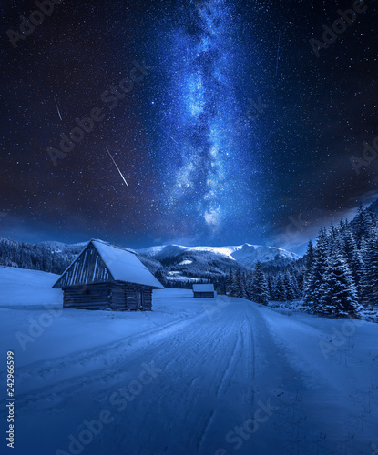 Obraz premium Droga Mleczna nad zaśnieżoną drogą w Tatrach, Polska