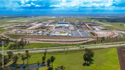 Fototapeta premium Drone aerial photograph of the new Western Sydney International Airport cargo precinct currently under construction in a large industrial development in greater Sydney, NSW Australia.