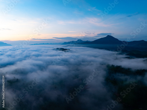 © Panya, Naklejka premium Drone aerial view of landscape mountains view in sunrise or sunset time,High angle view over countryside at northern Vietnam