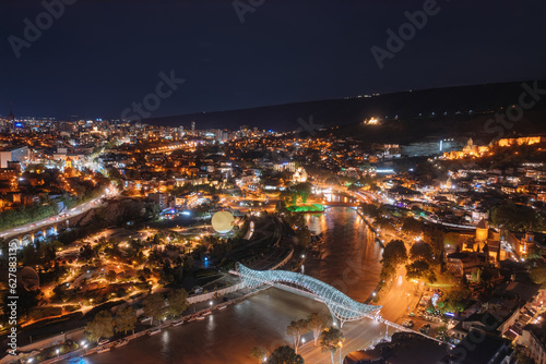 © Mulderphoto, Naklejka premium Drone aerial view of night Tbilisi downtown
