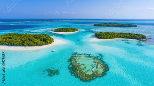 © Sansern, Obraz premium Drone capturing aerial shots of turquoise waters and islands nature scenic vibrant