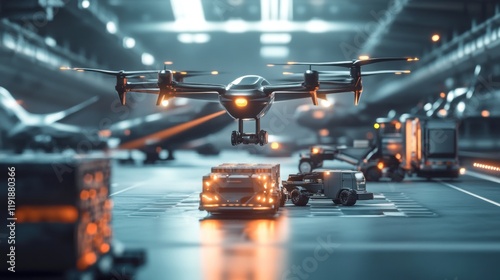 © Mega, Fototapeta premium Drone delivering package at night cargo facility.