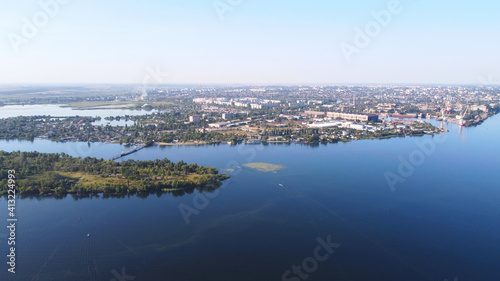© nata_zhekova, Fototapeta premium Drone fly over waving river of blue color surrounded by local village with various buildings and Wetland and marsh habitat with a reedbed of Common Reed aerial view.