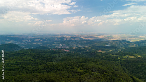 © Dimitar, Fototapeta premium Drone flying above green mountain forest revealing vast landscape with small village under cloudy sky