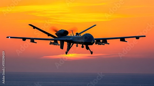 © Pannee, Fototapeta premium Drone Flying Against a Bright Orange Sunset Over the Ocean