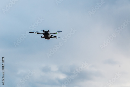 Fototapeta premium drone flying in cloudy blue sky, copy space.