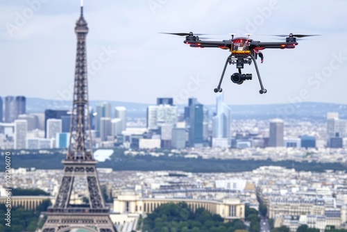 © LadiesWin, Fototapeta premium Drone flying over famous landmarks on International Drone Day