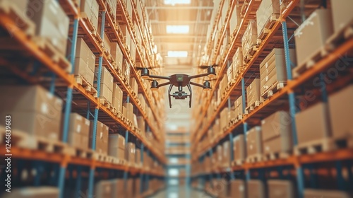 © kaiserseeing, Fototapeta premium Drone Flying Over Shelves in Modern Warehouse Space