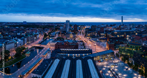 © Hans Malm, Obraz premium Drone footage at night over the city of Malmö Sweden