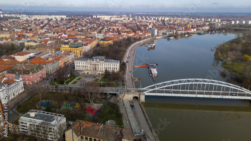 Obraz premium Drone footage from downtown of Szeged, Hungary on a sunny winter day. Szeged, Drone, Aerial, Hungary, Urban Landscape, Szeged Cathedral, Tisza River, Bridge