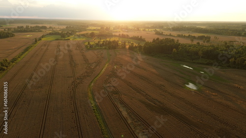 Naklejka premium Drone Horizon: Aerial Sunset Over Wheat Fields Agroculture