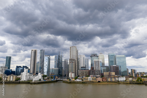 Fototapeta premium Drone image of Canary Wharf Skyline under a stormy sky from across the Thames.