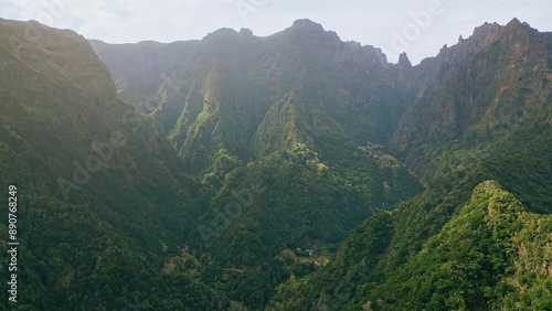 Fototapeta premium Drone mountains covered woodland. Majestic panorama green valleys with cliffs