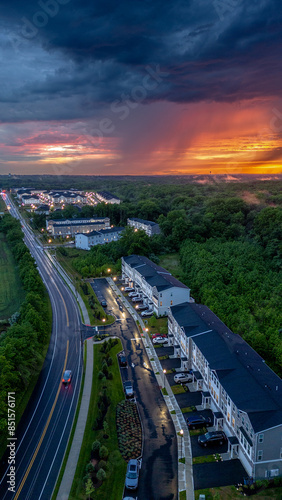 © Jin, Fototapeta premium Drone of Epic Sunset in New Jersey Suburbs Homes