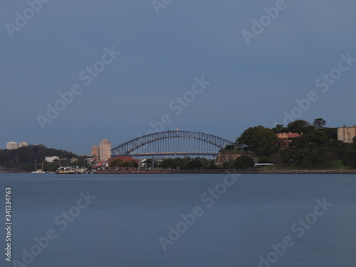© Elias Bitar, Naklejka premium Drone Panoramic Aerial view of Sydney Harbour and the beautiful vibrant colours of the afternoon showing smooth harbour waters