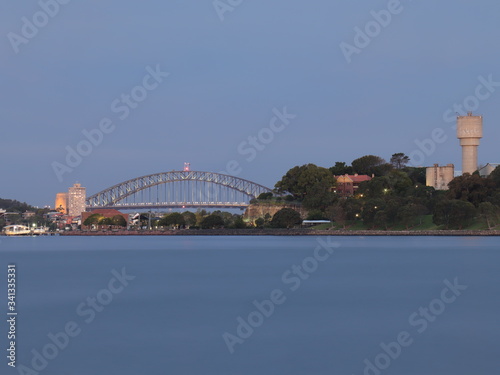 © Elias Bitar, Naklejka premium Drone Panoramic Aerial view of Sydney Harbour and the beautiful vibrant colours of the afternoon showing smooth harbour waters