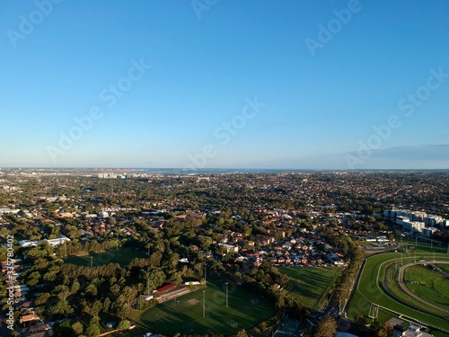 © Elias Bitar, Fototapeta premium Drone panoramic aerial view of Sydney NSW Australia city Skyline and looking down on all suburbs