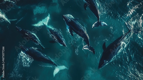 © Noii, Fototapeta premium Drone perspective of a whale pod in deep blue ocean