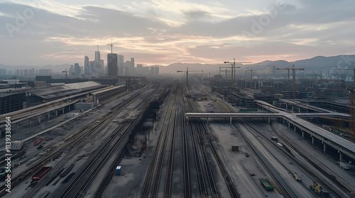 Fototapeta premium Drone perspective reveals an extensive urban construction site with geometric...