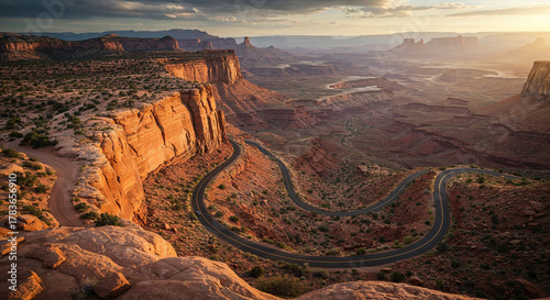 © Letyi, Naklejka premium Drone Photography of Canyon Road Through American Southwest Red Rocks Landscape