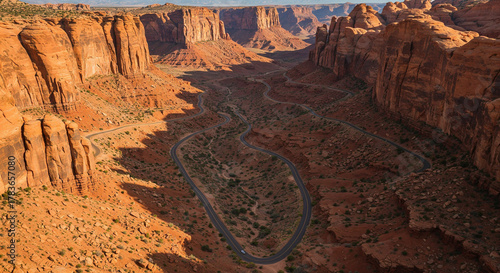 © Letyi, Fototapeta premium Drone Photography of Canyon Road Through American Southwest Red Rocks Landscape