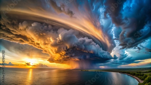 © prapatsorn, Obraz premium Drone Photography: Supercell Storm Wide Angle Lake Ocean View - Epic Weather Phenomenon