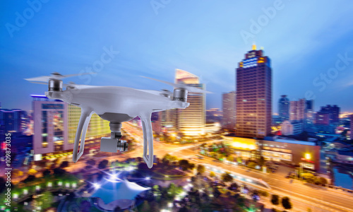 Obraz premium Drone quad copter with camera flying over the city center in night.