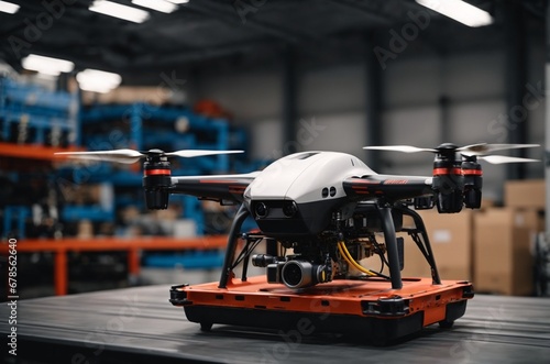 Fototapeta premium Drone quadcopter with digital camera in warehouse. Modern technology and innovation concept